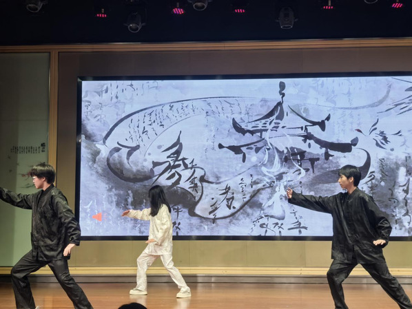 除了歌舞表演,太极社的同学们精心编排的表演也备受瞩目。三名队员以行云流水般的动作演绎四十二式太极拳,一招一式刚柔相济展现传统武学精髓;随后的太极推手环节以沾粘连随技巧诠释四两拨千斤的哲学,引发观众阵阵惊叹。